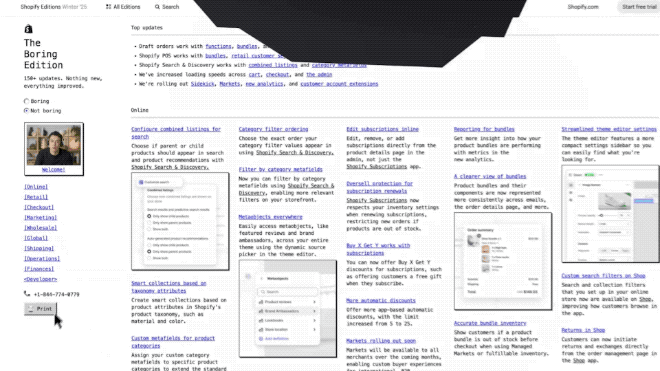 Shopify launched its “Boring” Winter ’25 Edition, but the Edition site is anything but boring. Built using a Shopify storefront product, the experience is all about engaging with the power and flexibility of Shopify.