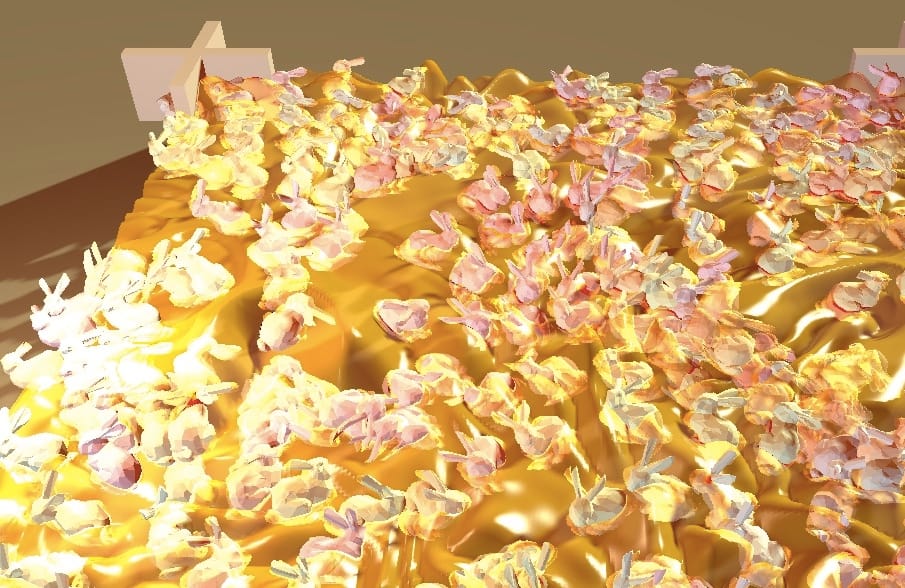 A mesmerizing demo of 2,000 Stanford Bunnies floating on a honey-like fluid, rendered with 2.7M triangles using Three.js. By Maeda Mameo.